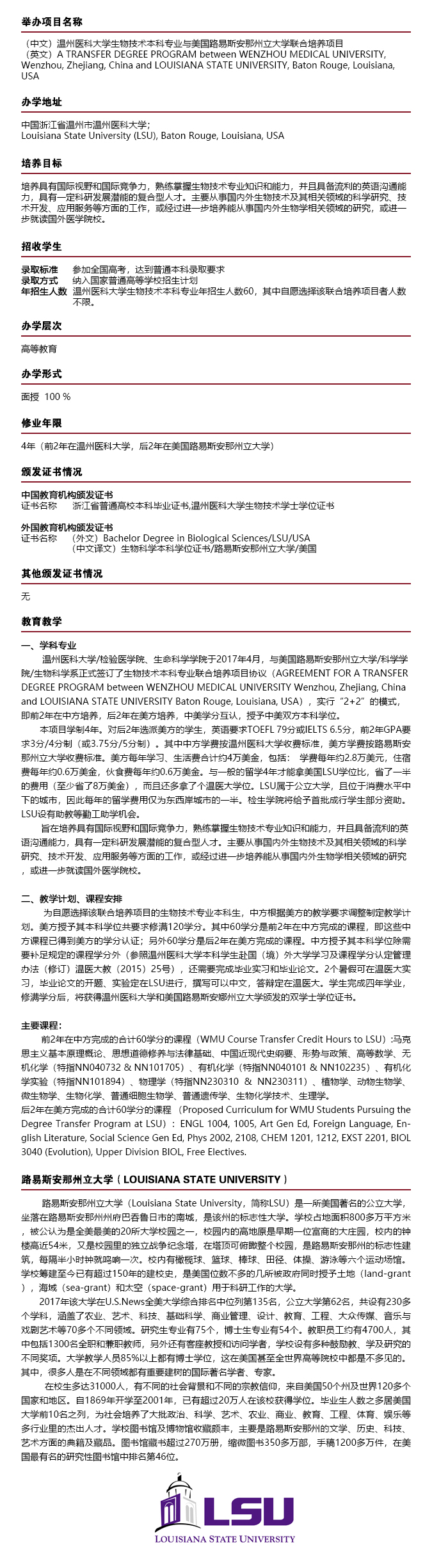 温州医科老员工物技术本科专业与美国路易斯安那州立大学联合培养项目