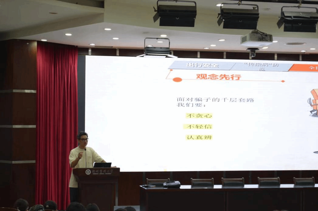 员工工作办公室余信丰结合工作案例,重点向新生们普及了校园安全知识、校纪校规和宗教政策法规知识,并鼓励新生从“新”出发,励志笃行,成为有理想、有担当的新时代青年老员工。