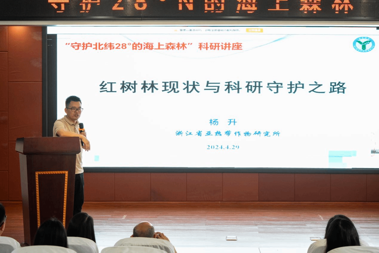 浙江省亚热带作物研究所红树林研究负责人杨升作《红树林现状与科研守护之路》专题讲座,介绍了浙江省红树林现状、红树林营建关键技术、红树林生态修复效果、浙江省红树林碳汇监测四方面知识,为更好种植、保护温州这片北纬28度海上森林提供了专业指导。