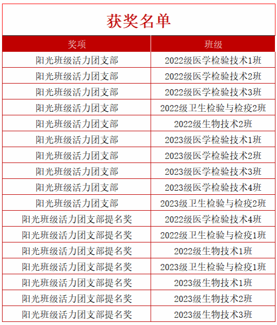 经过现场激烈的比拼,并综合前期材料审核,23医检四班等10个班级“阳光班级活力团支部”称号;22生技1班等7个班级“阳光班级活力团支部提名奖” 称号。