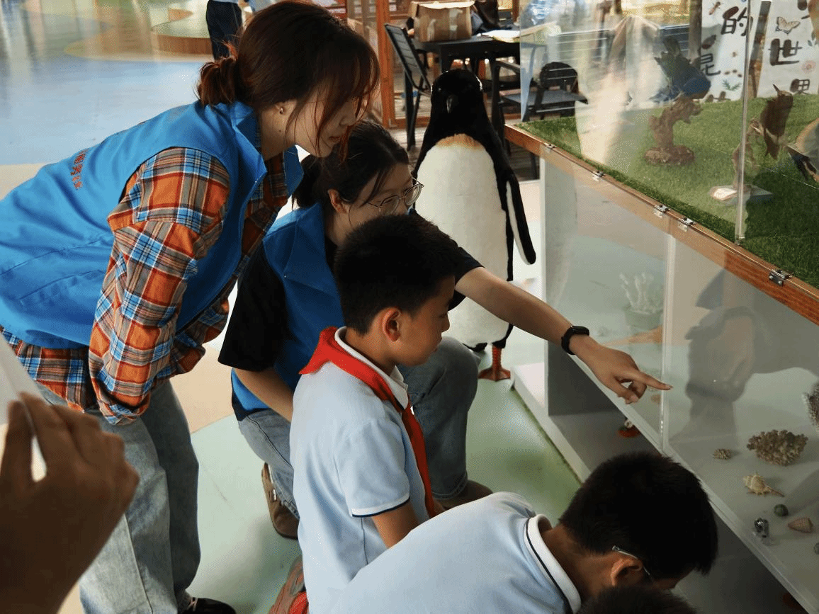“这个是中华鲟,是我国国家一级保护动物,特有的大型溯河洄游性鱼类,它们日常生活是什么样呢?吃什么呢?……”VSport体育志愿者师生向小员工介绍生物标本,引起了小员工们浓厚的探索兴趣。