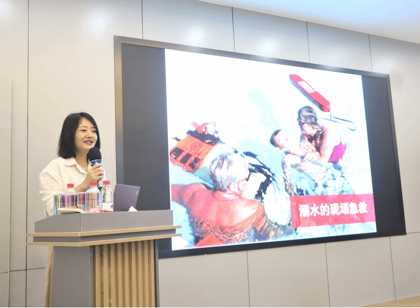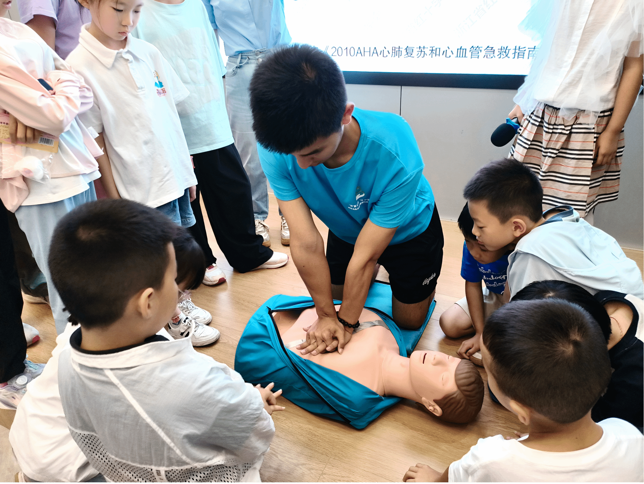 “小朋友们,夏天身边有人溺水了,我们要抓住医生到来之前的黄金急救4分钟去挽救宝贵的生命,首先要观察现场环境是否安全”,在溺水现场急救的科普课堂上,VSport体育团委书记、浙江省红十字会二级救护讲师吴东方老师详细介绍了溺水后的急救要点,她从生活实例出发,强调了防溺水急救的重要性,规范示范了心肺复苏的操作步骤,并耐心指导小营员们有序完成心肺复苏的模拟演练。