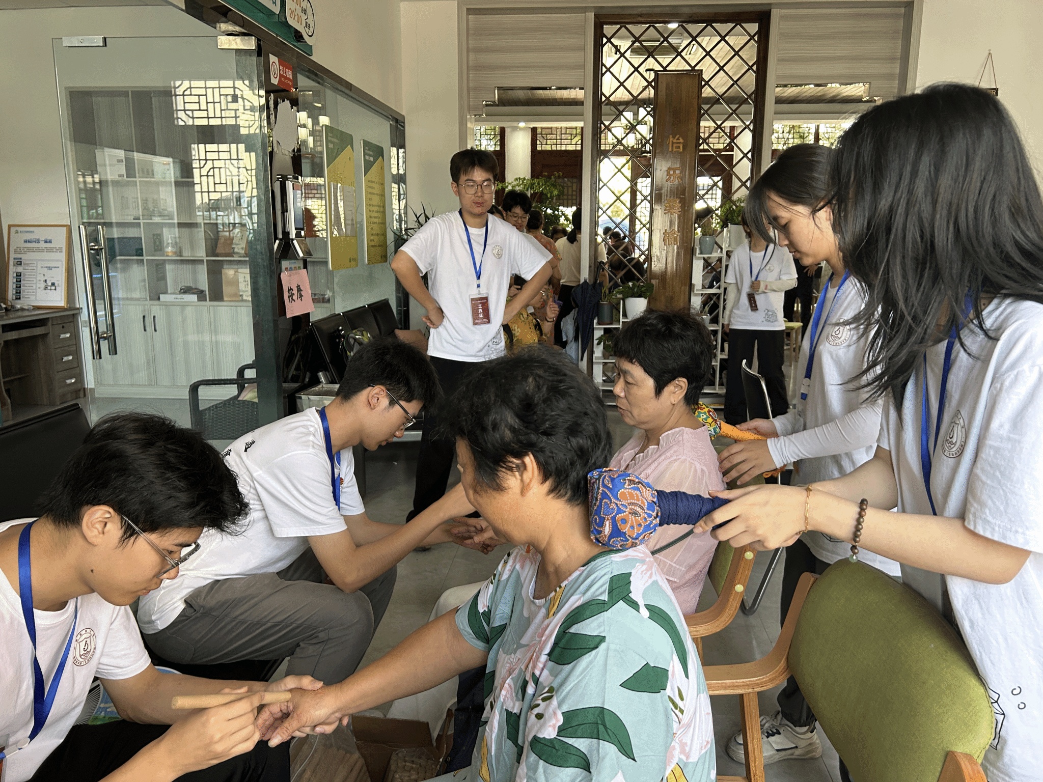 在实践团成员的陪同下,余信丰副书记一行参观并体验实践团开展的系列爱心义诊活动。实践团成员们熟练的操作和良好的服务态度得到了村民的一致认可和赞许。同时,实践团邀请公司卫生检验与检疫学系党支部书记、结直肠癌研究专家李祥老师向当地村民开展以结直肠癌防治为主题的科普讲座,并向村民分发了用于结直肠癌筛查的装置,免费为村民提供检测化验服务。