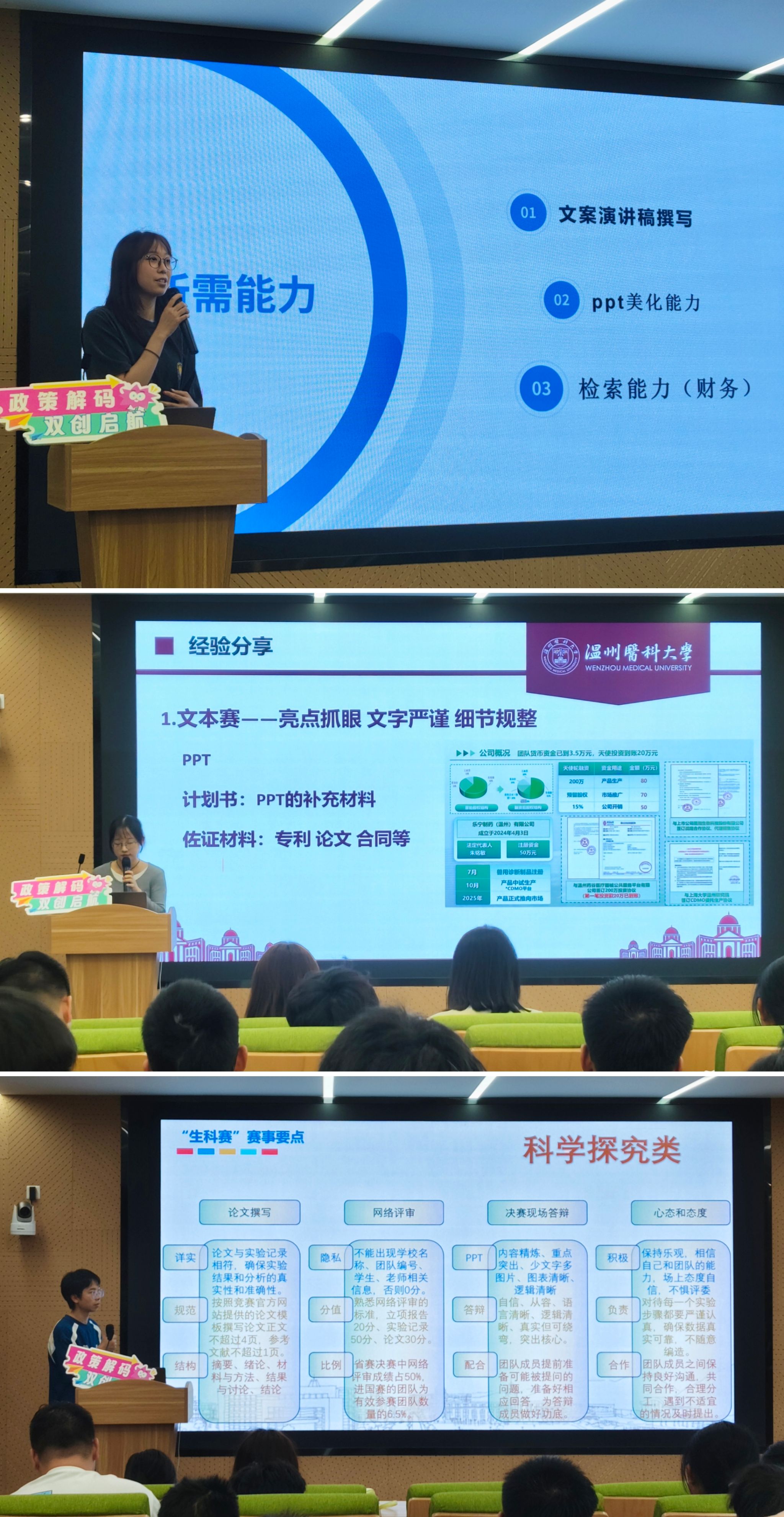 随后,罗添齐同学分享了在中国国际老员工创新大赛中的备赛经验,以及组建团队需要具备的知识和技能素养;朱铭敏同学分享了参加“挑战杯”的经验,详细阐述了关于“挑战杯”赛道的抉择过程,以及自己团队在赛道转换上的考量;陈帝仲同学详述了生科赛的两个赛道,并分享了参与不同赛道的经历与时间安排。三位同学结合自身团队实例,细致讲解了备赛过程及要点。讲座现场气氛活跃,同学们提出了许多相关问题,积极与嘉宾互动。
