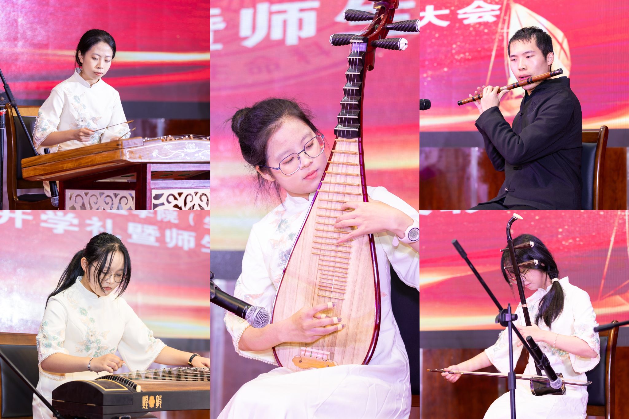 传统与现代交融,国风与流行碰撞,校艺术团民乐队用笛子、二胡、古筝、琵琶和扬琴等传统管弦乐器共同演奏了电子国风曲《寄明月》,传达了那份亘古不变的深厚情感。