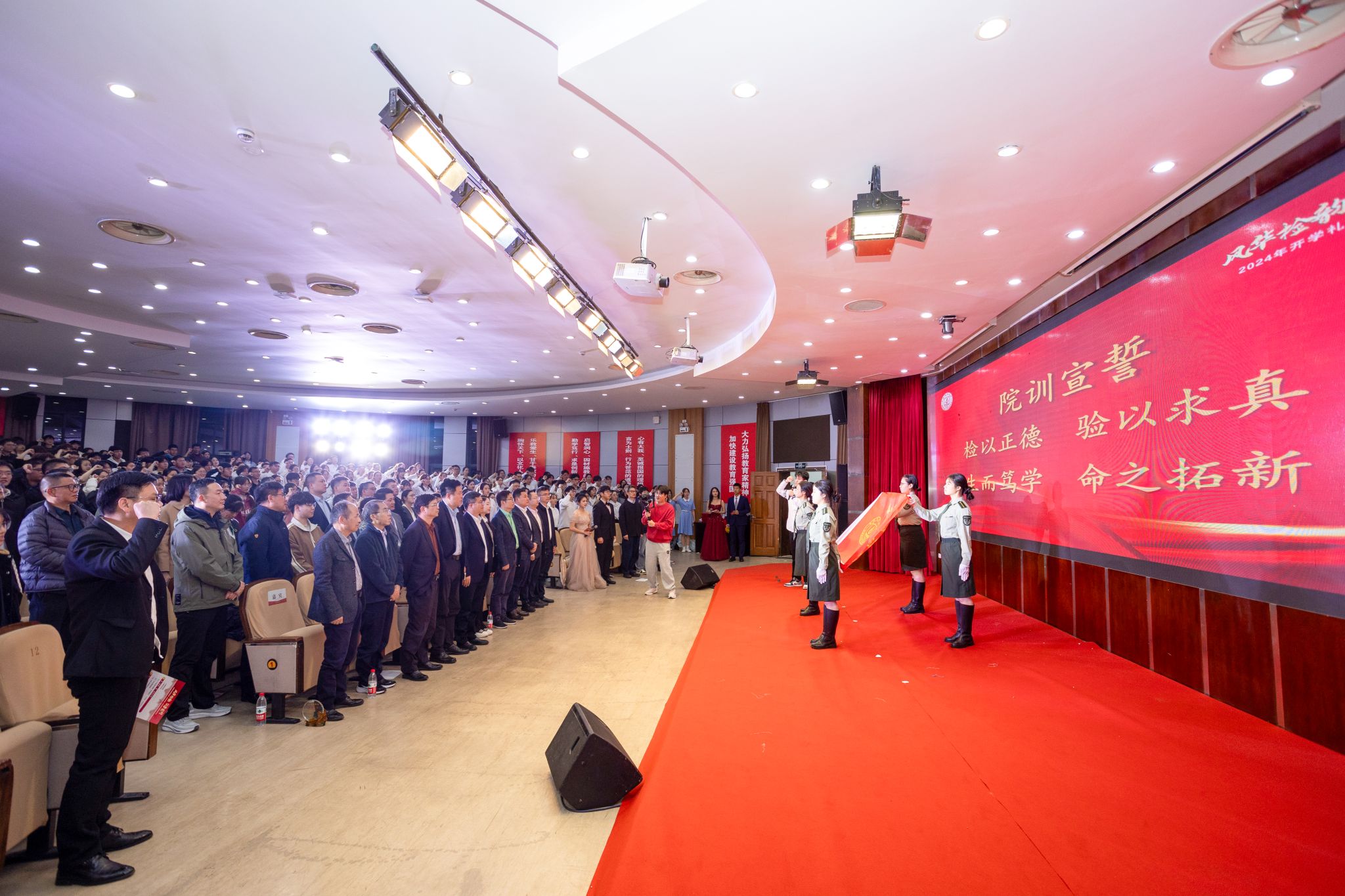 披上白衣,走入检生,我们就是检生人。国旗护卫队出旗,公司师生面对着院旗,庄严宣誓:检以正德,验以求真;生而笃学,命之拓新。铿锵有力的誓言勉励全体师生坚守初心,同心谱写新华章。