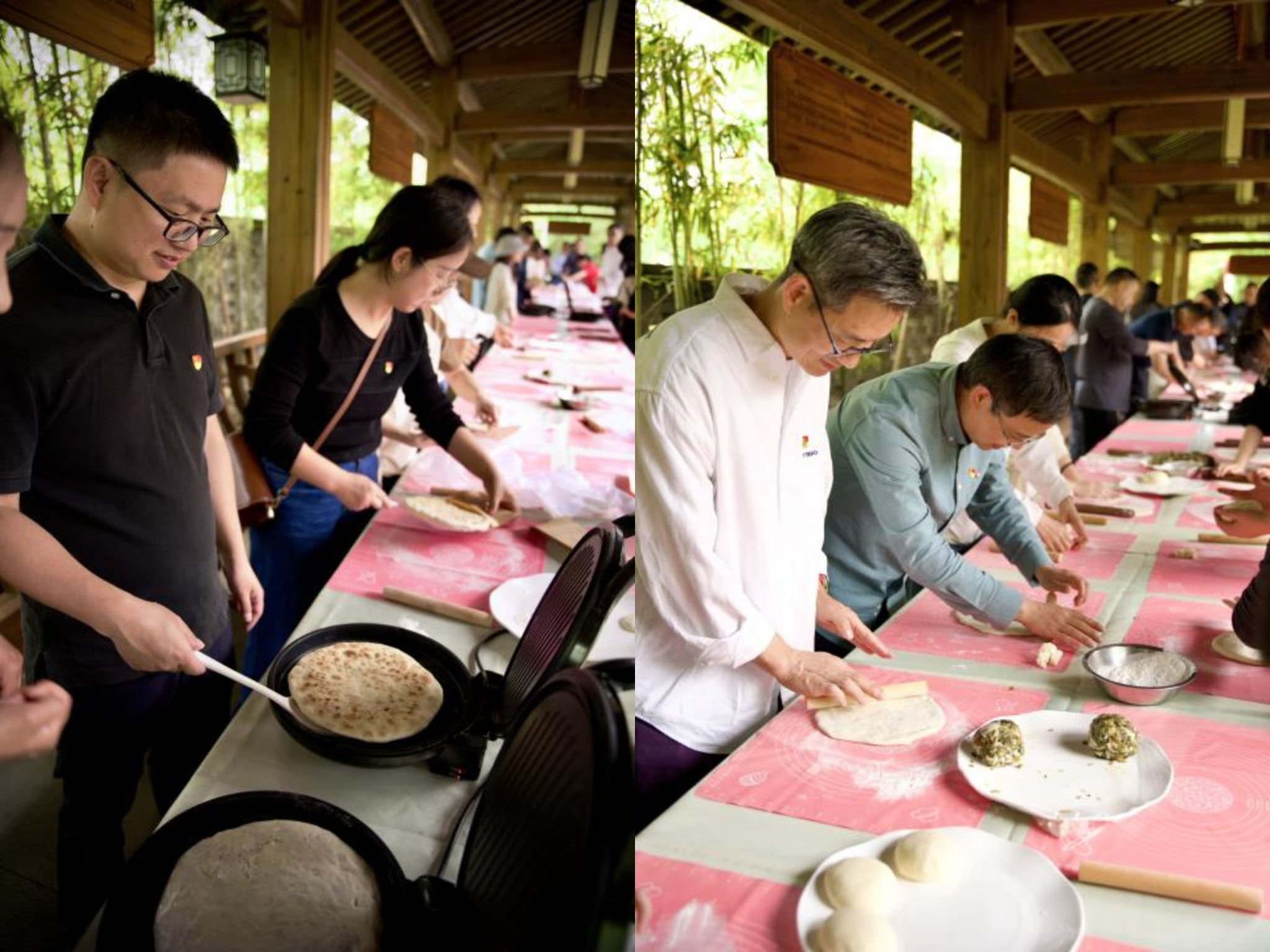 在永嘉传统工艺体验馆,老师们系统学习了"三粉一馅"麦饼制作传统工艺,完成揉面、塑形、包馅、烘烤等工序。当金黄酥脆的麦饼膨胀隆起,飘香四溢,老师们感叹于传统民俗工艺的巧妙。"平时只是品尝过麦饼,亲身参与制作更传承了这份传统民俗文化。"参与制作的老师说道。这道承载着永嘉山水智慧的非遗美食,既展现了独特的地域文化符号,也让传统技艺在互动体验中得到活态传承。
