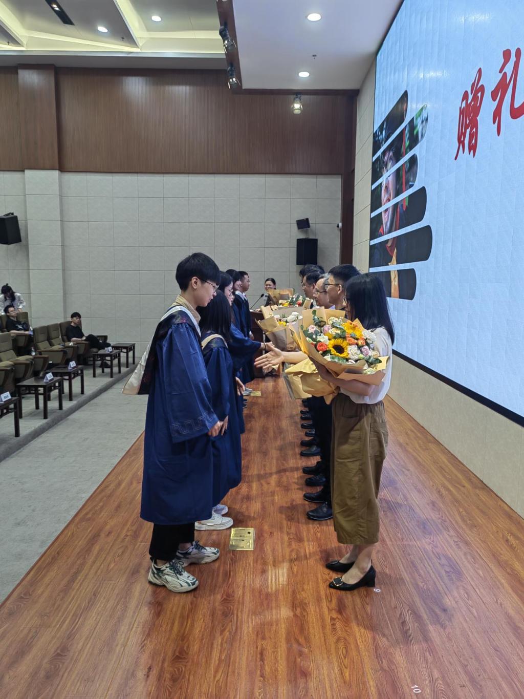 毕业分别之际,毕业生与导师代表互赠礼物表达情意。导师们一一上台为毕业生们送上公司精心准备的专属礼物。受礼后,优秀毕业生代表为导师们献上鲜花并鞠躬致谢。