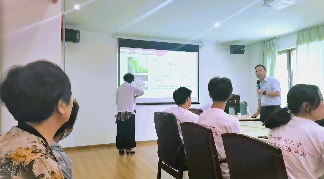 卫生检验与检疫学系党支部书记李祥老师以海量癌症数据为切入点,图文并茂地向大家科普癌症早期治疗的重要性、检查结肠癌的主要手段以及癌症发病的可能原因,并呼吁大家做到“早发现,早诊断,早治疗”。他指出,肠道菌群可帮助人体进行消化吸收,维护身体内该菌群的稳定,可以有力地降低结肠癌的发生率。如何稳定体内菌群呢?面对居民的提问,李祥老师强调:“药物只能起到暂时性的作用,合理的饮食结构、健康的生活习惯才是预防疾病的最好方式。”他还用温州方言向大家介绍了一种抗肠道炎症的植物——羊栖菜,它对抑制结直肠癌肿瘤的形成与发展具有显著效果。