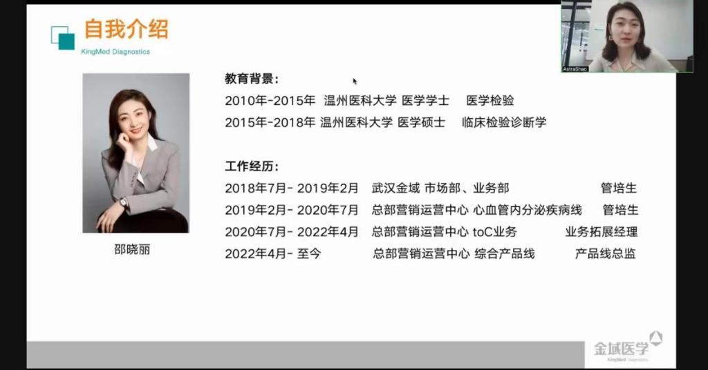 邵晓丽是公司医学检验专业2015届本科生,临床检验诊断学2018届硕士研究生,毕业后作为管理培训生进入金域医学集团,曾在北京、武汉等分公司担任业务拓展经理等职务,2022年在广州金域医学总部营销运营中心临床医学部任职综合产品线总监。