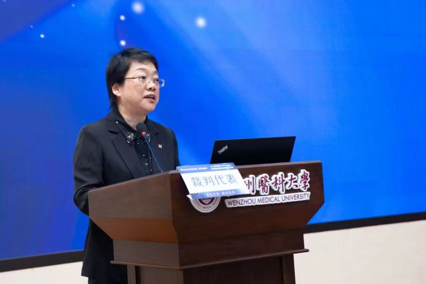 裁判代表阮萍教授发言,在疫情肆意下,各师生参赛热情不减,克服困难,投入大量的人力物力,保障本次大赛的举办。本次技能大赛,不仅是对实践教育的检验,也是各校相互交流的机会。以上一次的比赛经验为基础,我代表全体裁判员向大家表示,我们将服从大赛组委会的安排,严格执行比赛规则,坚守岗位,做到公平公正,尊重选手,尊重事实,绝不徇私舞弊,以良好的道德风尚,全心全意投入比赛,履行好裁判员的职责,请大家给予监督。