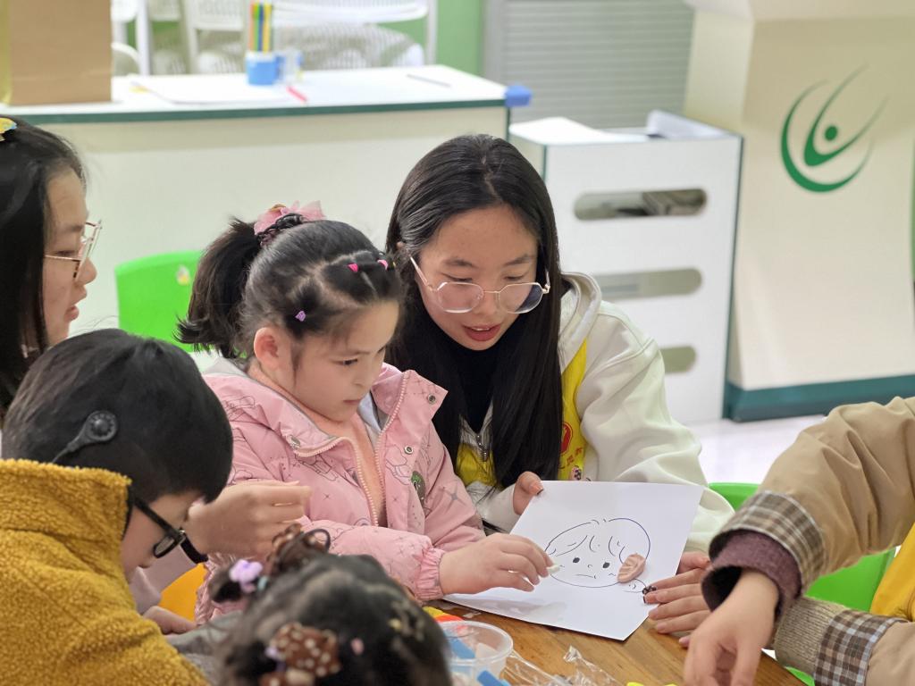 “与‘泥’同乐 ,妙绘春天”手工活动。此环节把知识“融”进了泥里,将真情传递在指尖。在志愿者的帮助下,小朋友们将橡皮泥捏成不同的形状,例如大象、狮子等。其中一位小朋友捏出了耳朵的形状,为纸上的卡通小人补全了五官,收获了大家肯定鼓励的掌声。