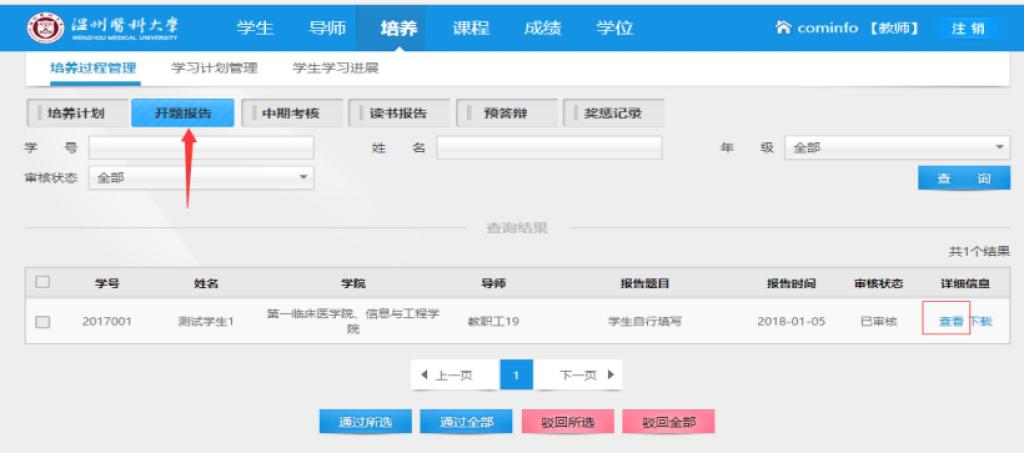 2、经导师审核,通过网址http://xinxi.yjsy.wmu.edu.cn进入系统后点击“培养”→“培养过程管理”→“开题报告”。请点击查看进入“开题报告”详情页面,点击修改填写 “导师组对预实验的意见”并进行提交,然后再点击通过。