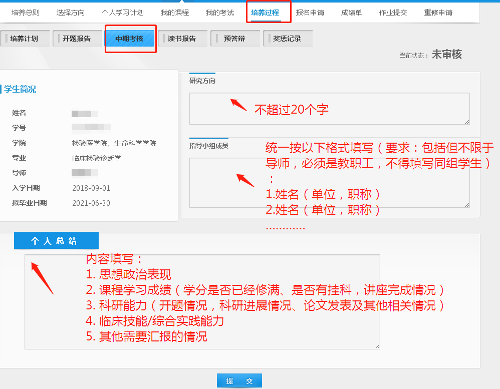员工自查培养环节完成情况(课程学习,开题,临床轮转,学术报告等),登录“员工服务系统”后在“培养”—“培养过程”—“中期考核”填写研究生个人总结一栏并提交保存(注:员工填写中期考核之前需已在系统中完成培养计划登记及开题报告登记,否则系统无法通过)。