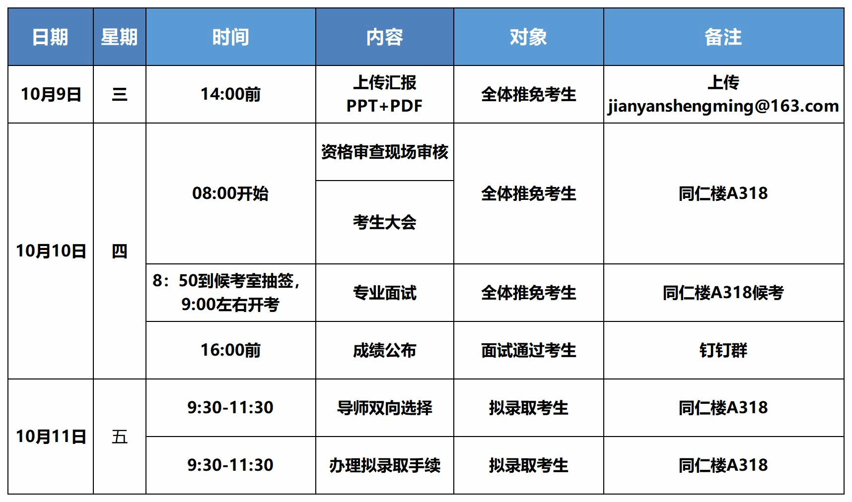 (四)提交个人陈述环节汇报PPT到邮箱jianyanshengming@163.com,汇报PPT需同时制作成PDF版本,两者均以报考专业+姓名+考生编号命名,在10月9日14:00前打包发送到jianyanshengming@163.com,材料一经发送,不接受修改。PPT具体内容要求详见第四点复试内容。