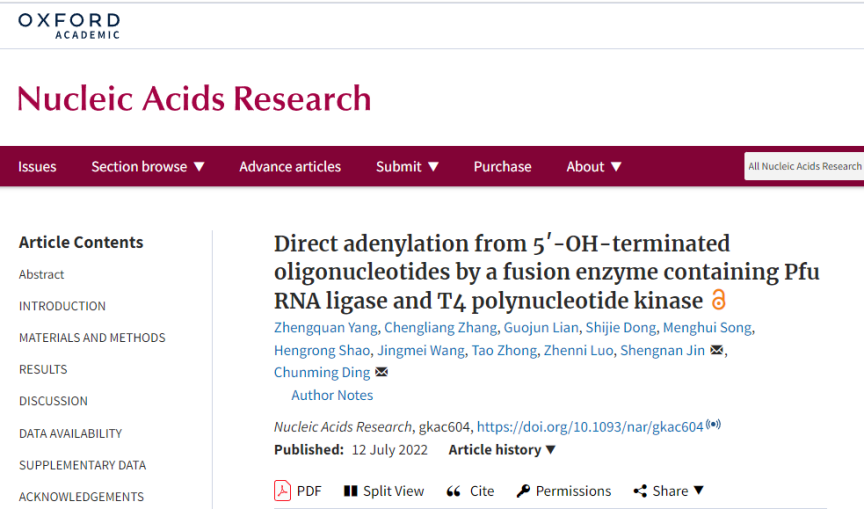 近日,公司丁春明和金胜男科研团队博士后杨政权在国际著名刊物Nucleic Acids Research上发表题为《Direct adenylation from 5′-OH-terminated oligonucleotides by a fusion enzyme containing Pfu RNA ligase and T4 polynucleotide kinase》的研究论文。该研究筛选和鉴定了一种新型热稳定腺苷酰化酶,并在此基础上开发了一种具有磷酸化与腺苷酰化活性的双功能酶,首次实现了对羟基末端DNA底物的酶法直接腺苷酰化催化。