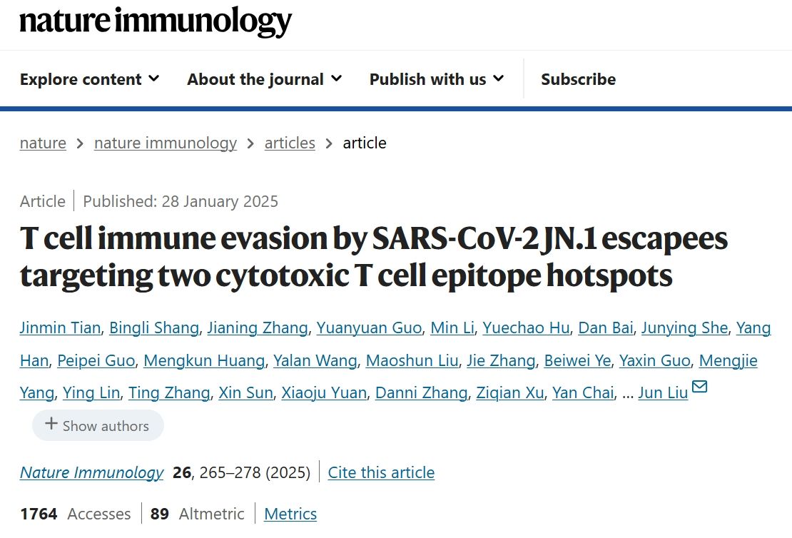 在最新一期的国际顶级学术期刊《自然免疫》(Nature Immunology,近五年平均影响因子28.4,中国科公司一区),公司2024届临床检验诊断学硕士毕业生尚丙丽同学以共同第一作者身份,公司2022级医学技术硕士研究生折俊颖同学以第三作者身份,公司2017届优秀员工刘科芳研究员以共同参与作者身份,发表了题为“T cell immune evasion by SARS-CoV-2 JN.1 escapees targeting two cytotoxic T cell epitope hotspots”的研究论文。