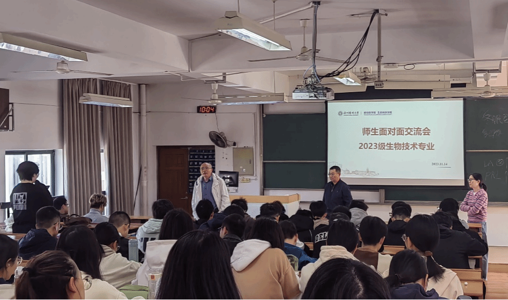 生物技术专业新生教育大会采取师生面对面交流的方式,生物技术专业负责人李伟老师和生物技术专业发展中心主任艾为明老师参加交流会。会上同学们就专业学科认知、日常学业问题、考研就业方向、核心必备素质等方面提出问题,老师们从实际出发,为同学认真答疑解惑,各位新生与老师们进行交流互动,现场气氛轻松活跃。李伟老师鼓励新生充分利用公司资源,为自己设立短期和长期的目标,脚踏实地,持之以恒;在完成学业的同时,积极参与社会实践、学科竞赛等活动,不断发展自己解决问题的能力。