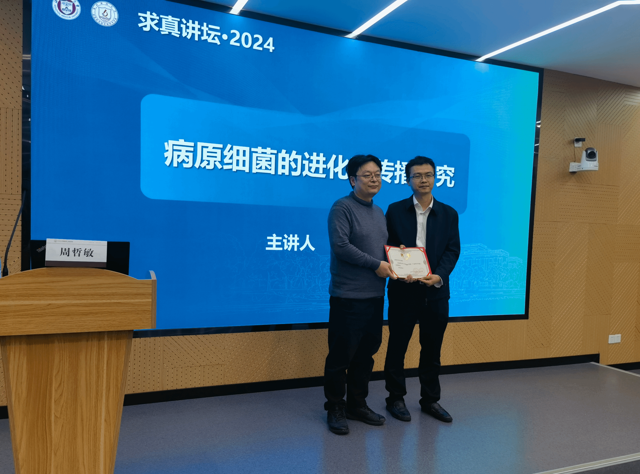 10月23日,江苏省特聘教授周哲敏应邀来我院开展求真讲坛专家讲座,本期讲坛主题为《病原细菌的进化和传播研究》,公司经理郑晓群教授、学科带头人陆家海教授以及各教师代表参加,讲座由公司副经理黄海山教授主持。
