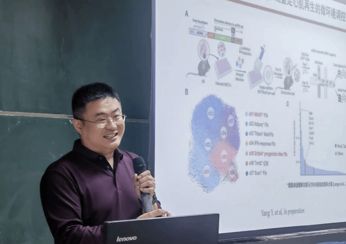 本次讲座,赵扬教授首先回顾了细胞命运重编程的理论和发展史,结合课题组早期的系统性工作,总结了体外重编程尤其是化学重编程的诸多进展。在此基础上尝试了体内原位重编程,围绕心脏疾病中心肌细胞死亡后难以再生的世界级难题,研究组揭示了一系列在体诱导心肌再生的内、外源调控因子,解决了心梗损伤部位肌成纤维细胞重编程为心肌细胞的低效问题;揭示了其心梗微环境中的关键负向调控因子——巨噬细胞来源的IFN/Stat1信号通路,以及TGF-β激活的下游Meox1表达;最终利用严格的双重组酶谱系示踪系统验证了“在体重编程”诱导心肌高效再生可行性,为解决心脏再生治疗心梗等心脏疾病提供再生医学新途径。
