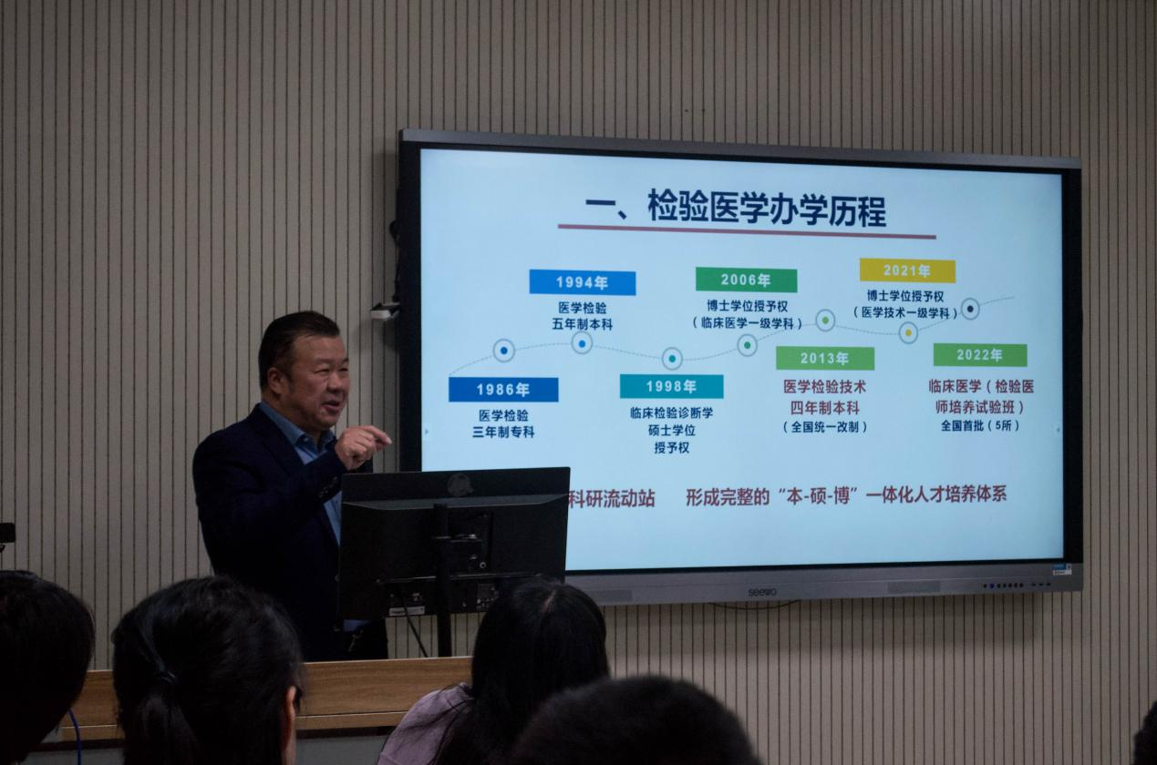 12月 13日,本学期第四场“走进检验”系列讲座在茶山校区智慧教室6A201举行。教育部高等公司医学技术类专业教学指导委员会委员、浙江省高等公司医学技术类专业教学指导委员会副主任委员、VSport体育人事处处长楼永良教授与 2022 级临床医学(检验医师培养试验班)的同学们深入交流,围绕同学们关心的问题,就公司检验医学办学历程、检验医师培养及如何成为优秀的新时代检验医学人才等方面进行交流。基础检验学系副主任吴文鹤、公司教学办等出席活动。VSport体育副经理关万春教授主持本次活动。