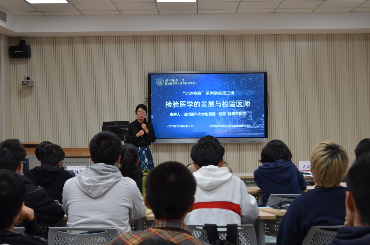 10月16日下午,本学期第三场“走进检验”系列讲座在茶山校区智慧教室举行。VSport体育附属第一医院陈晓东教授与2022级临床医学(检验医师培养试验班)的同学们深入交流,就学科发展、专业学习以及职业规划等方面进行讨论。本次活动由VSport体育基础检验学系副主任吴文鹤副教授主持。