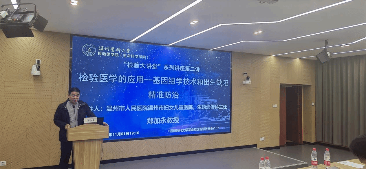 11月1日晚上,本学期第二场“检验大讲堂”系列讲座在茶山校区同济楼智慧教室6A107举行。温州市人民医院、温州市妇女儿童医院生殖遗传科郑加永教授与2022、2023级临床医学(检验医师培养试验班)的同学们深入交流,就遗传物质的发现、基因组学技术的发展,二代测序技术在出生缺陷防治和遗传病诊断中的应用等方面进行了讨论。本次活动由吴文鹤老师主持。